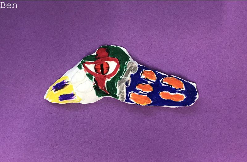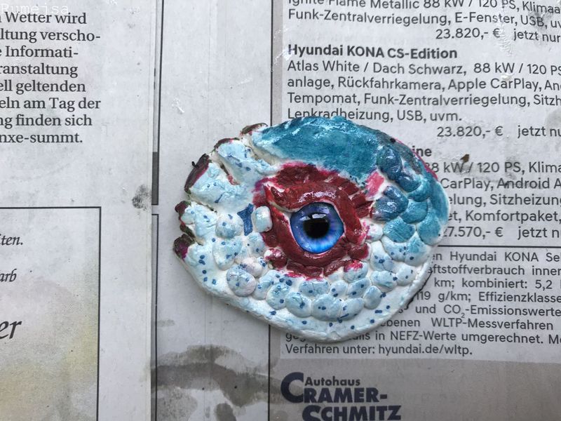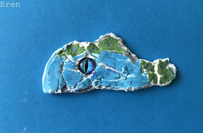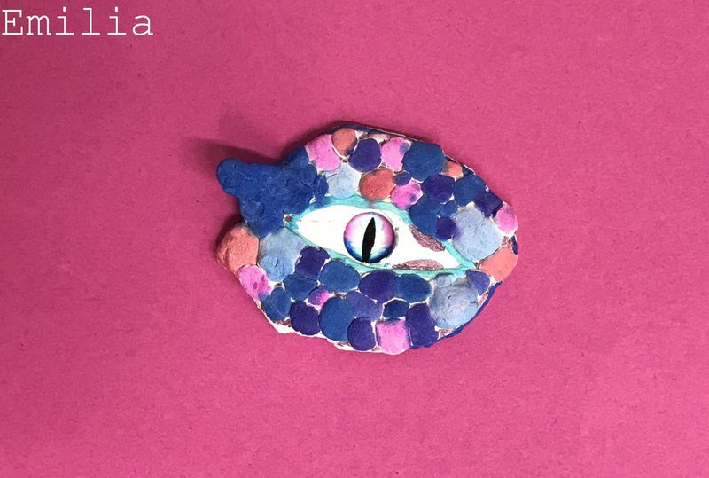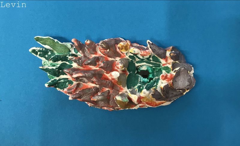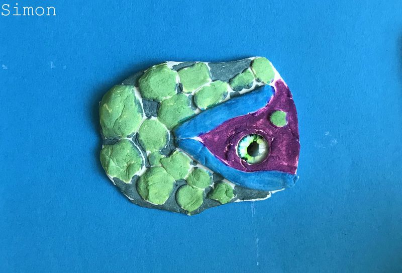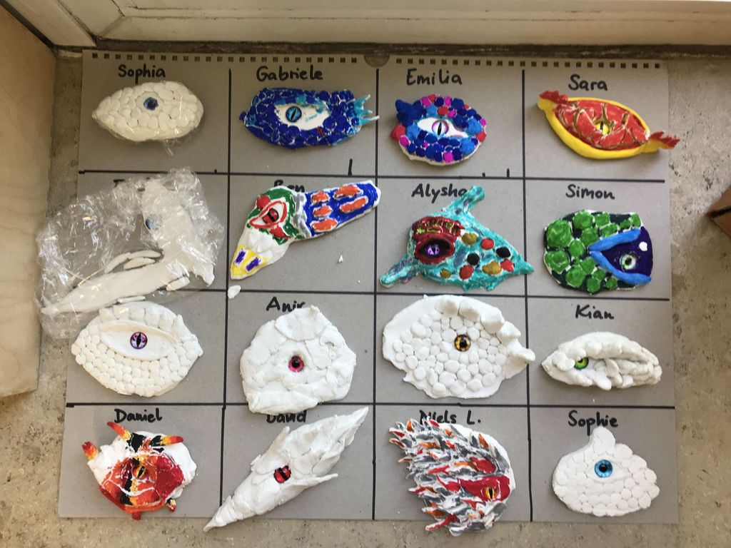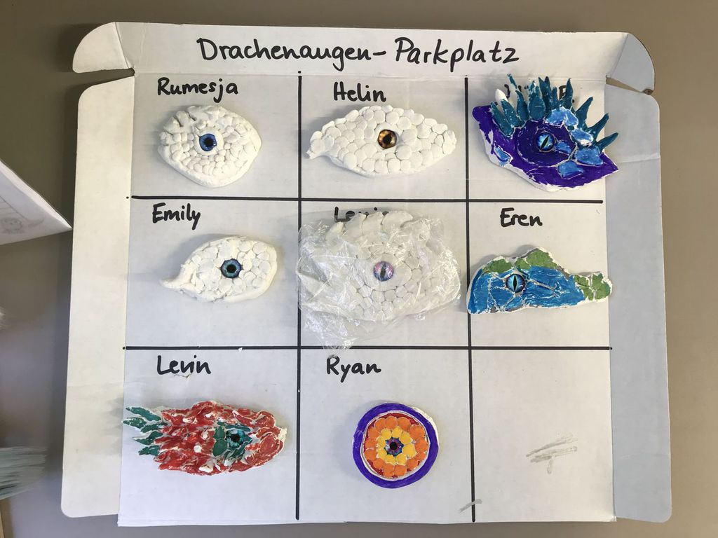 Die Kinder der Klasse 4a fertigten aus Modelliermasse um ein bestehendes Glasauge herum Drachenaugen mit schuppiger Haut an, die sie mit Fasermalern nach der Trocknungszeit bemalten. Bei dieser Aufgabe konnten die Schülerinnen und Schüler ihrer Phantasie freien Lauf lassen und ganz eigene Charaktere erschaffen. Wasser- Luft- und Feuerdrachen sind herausgekommen, tollpatschige Gesellen oder aber angriffslustige Panzerdrachen blicken uns neugierig an.